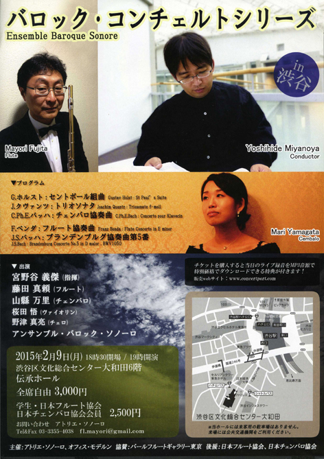 ・出演 指揮:宮野谷 義傑 フルート:.藤田真頼 チェンバロ:山縣万里 ヴァイオリン:桜田悟 |